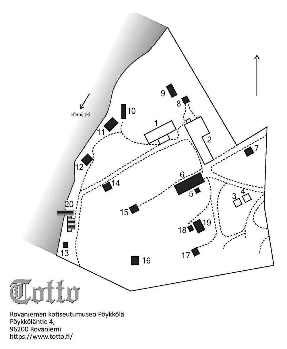 Rovaniemen kotiseutumuseon alue sijaitsee Kemijoen rantatörmällä. Museon neljä alkuperäistä ja 13 siirrettyä rakennusta kuvastavat talonpoikaisajan maalaiselämää 1800–1900-luvun taitteessa. Päärakennus, 40 metriä pitkä puovi ja kaksi aittaa kuuluivat Pöykkölän tilaan, jonka Kotiseutuyhdistys Rovaniemen Totto ry osti Kemiyhtiöltä vuonna 1957.